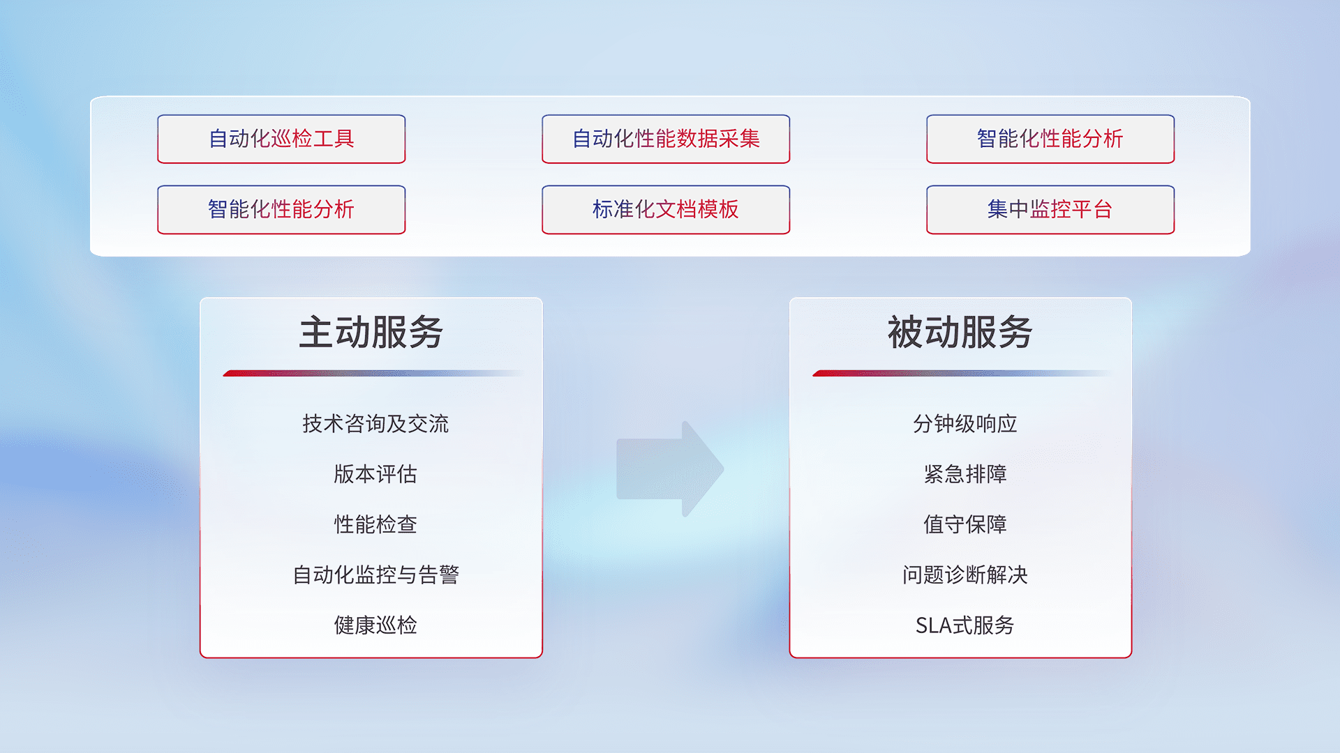 智能化工具和标准化文档,,,保障服务质量,,,,提供主动服务(包含技术咨询、、版本评估、、、性能检查、、、、自动化监控与告警、、健康巡检)和被动服务包含(分钟级响应、、紧急排障、、值守保障、、、问题诊断解决、、、、SLA服务)。。。